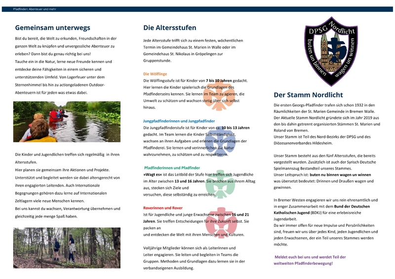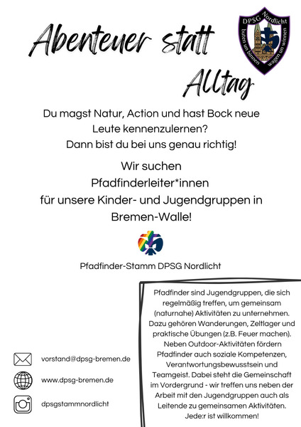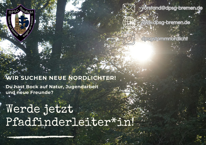 wir sind der Pfadfinder Stamm DPSG Nordlicht aus Bremen Walle und suchen ab sofort neue Gruppenleiter*innen für unseren Stamm.