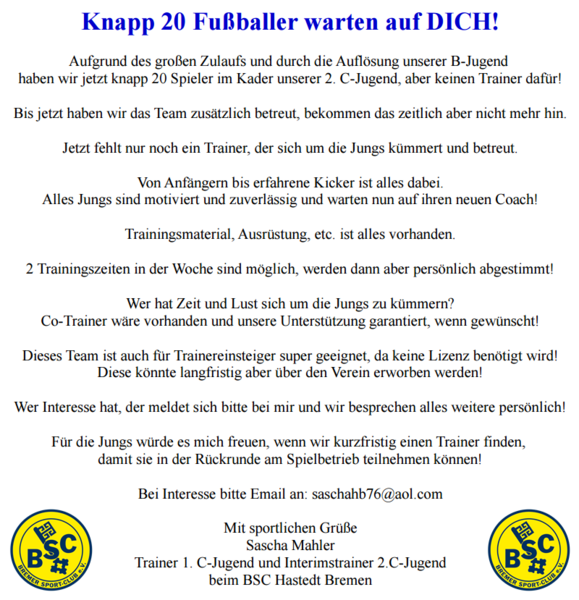 Wir suchen immer noch jemandem, der sich um die Jungs kümmern möchte. Also, ob erfahrener Trainer, der gerade ohne Engagement ist und eine neue Herausforderung sucht, oder Neuanfänger, der sich ausprobieren und in die Rolle rein wachsen will. Die Jungs und wir hoffen, dass wir jemand finden, der den Job übernehmen möchte. Sie hätten es sich verdient.