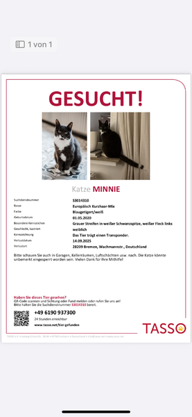 Seit Sonntag den 14. September, 7 Uhr ist unsere Katze nicht mehr aufgetaucht.
