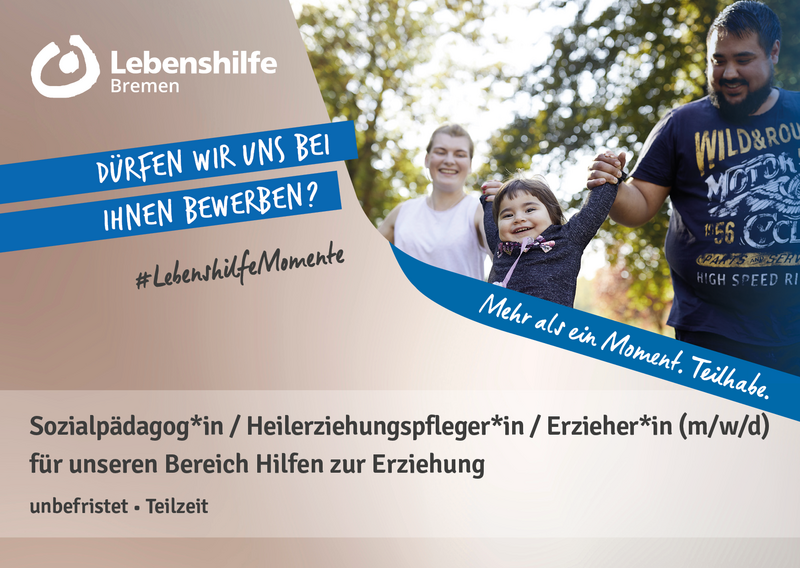 Lebenshilfe Bremen | Fachbereich Kinder, Jugendliche und Familien | Waller Heerstr. 55 | 28217 Bremen | karriere@lebenshilfe-bremen.de