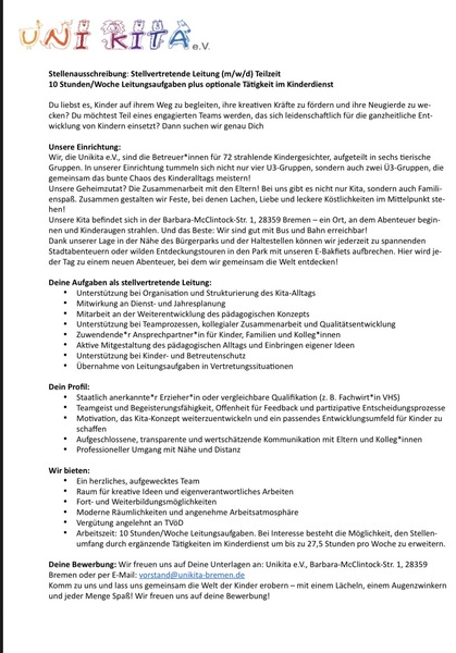 Wir freuen uns auf Deine Unterlagen an: Unikita e.V., Barbara-McClintock-Str. 1, 28359 Bremen oder per E-Mail: vorstand@unikita-bremen.de