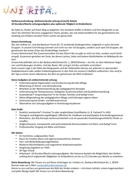 - Stellvertretende Kitaleitung (m/w/d) Teilzeit