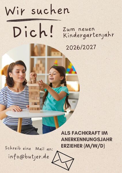 Wir, der Elternverein Borgfelder Butjer e. V. mit fünf Gruppen, suchen ab 01.08.2026 eine motivierte Fachkraft im Anerkennungsjahr.