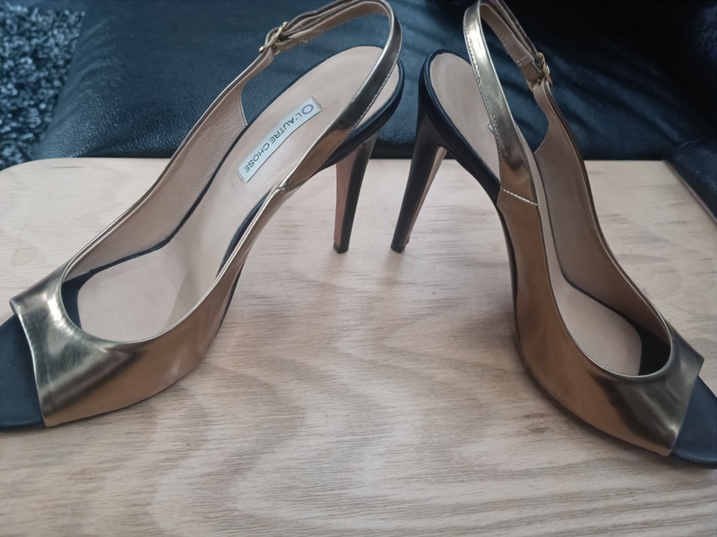 zum Verkauf stehen 2 Paar High Heels, ein Paar in gold Größe 40 MADE IN ITALIEN, ein paar in schwarz Größe 38.