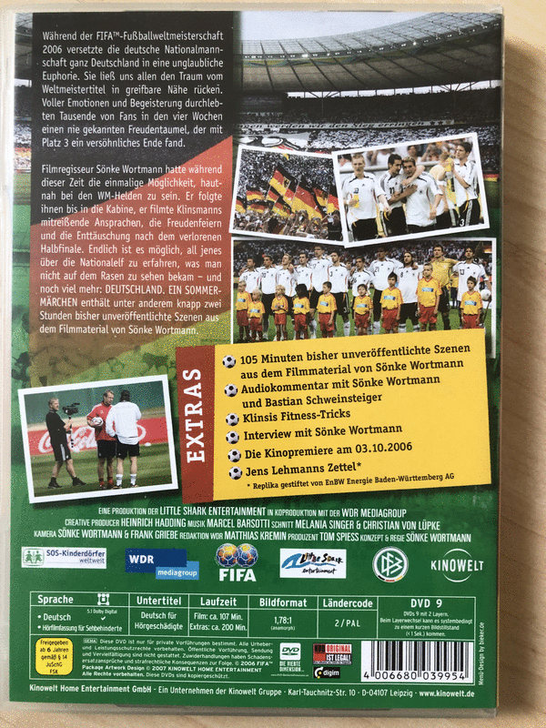 Ein Sommermärchen (2 DVD Special Edition) ist ein deutscher Kino-Dokumentarfilm des Regisseurs Sönke Wortmann. Er zeigt die deutsche Nationalmannschaft auf dem Weg zur und bei der Fußball-Weltmeisterschaft 2006. Laufzeit: 1 Stunde und 47 Minuten.