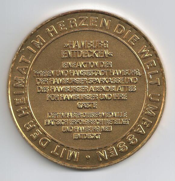 Material: Bronze vergoldet, Ø Durchmesser: 60 mm, Gewicht: 58 g. Vorderseite: Silhouette der Stadt mit markanten Gebäuden, Motorschiff, Wappen, Motto „Ich mag Hamburg“, Rückseite: Umschrift „Mit der Heimat im Herzen die Welt umfassen“ Aktion „Hamburg entdecken“. Gesuchtes Sammlerstück, sehr selten. Hoher Symbol- und Sammlerwert. Diese tolle Rarität sucht jetzt einen liebevollen Neubesitzer und ist ein kostbarstes Geschenk für einen Sammler oder sich selbst. Unbeschädigter Artikel in einem sehr guten Zustand, Privatverkauf, siehe Fotos, jetzt nur 12€ oder machen Sie gerne ein Angebot, Versand (€ 4,00) bei Kostenübernahme möglich