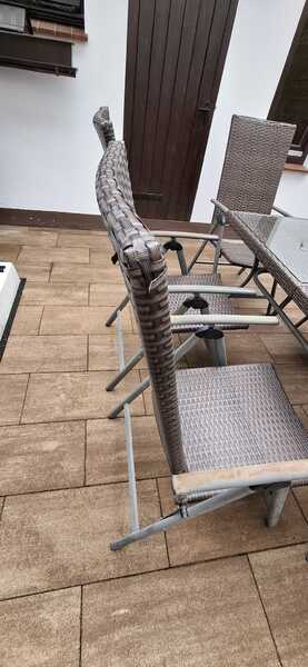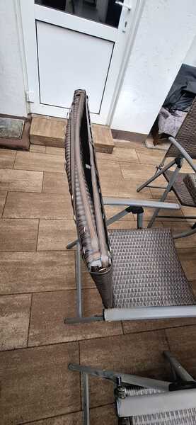 6 Hochlehner-Stühle klappbar. Bei 2 Stühlen ist an der Rückenlehne oben das Geflecht aufgegangen - siehe Bild.