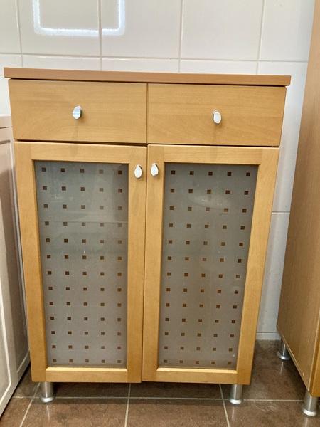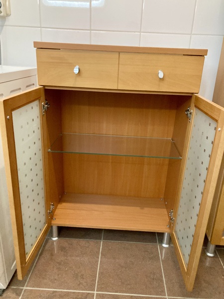 Badezimmerschrank Buche Breite 65 cm Tiefe 33 cm und Höhe 96 cm mit einer Schublade und einem Glasboden zu verkaufen VB 40€, Tierfreier und Nichtraucherhaushalt