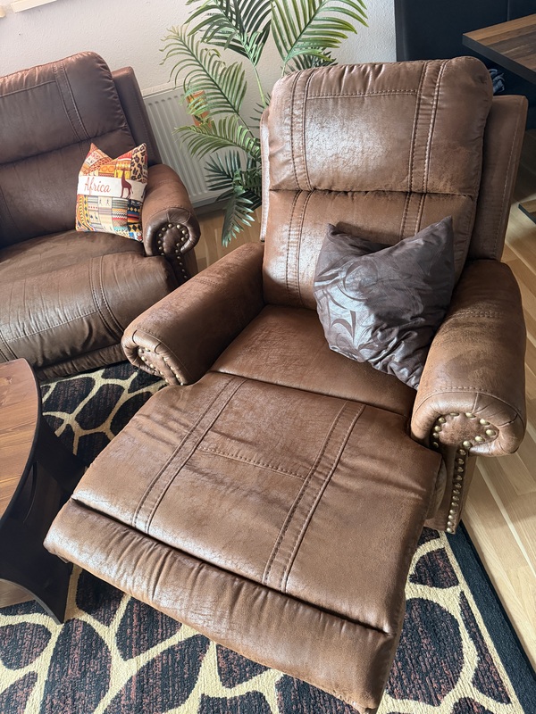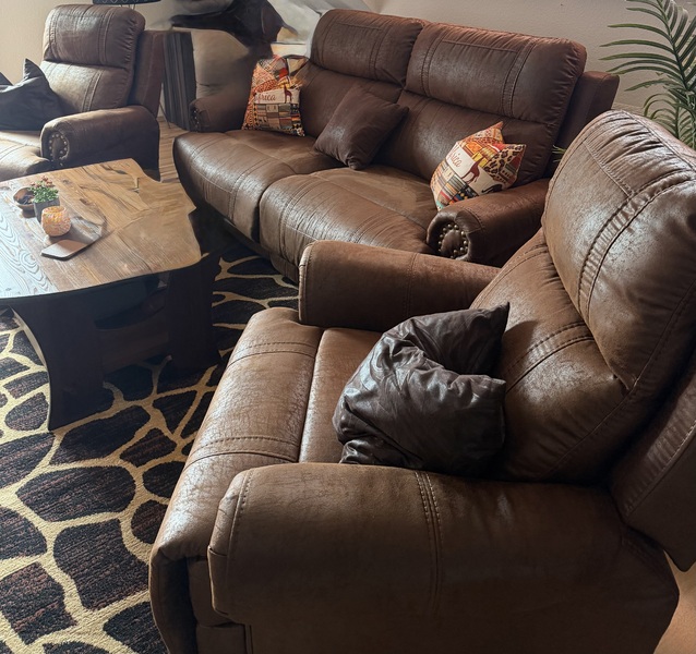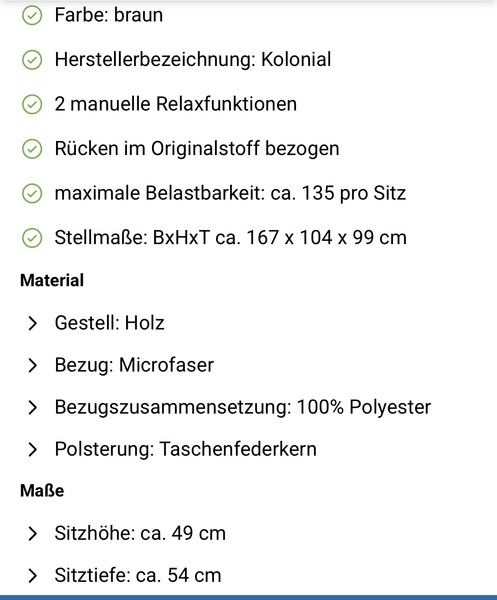 Ich verkaufe ein bequeme Couchgarnitur bestehend aus einem Zweisitzer und zwei Sesseln in der Farbe Braun im Kolonialstil, alle mit Relaxfunktion. Beschreibung und Fotos anbei. Die Möbel sind gebraucht aber sehr gut erhalten und für 1.200 Euro VB an Selbstabholer abzugeben.