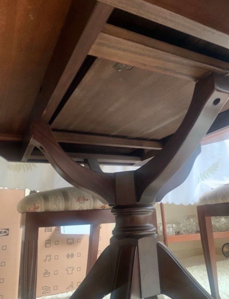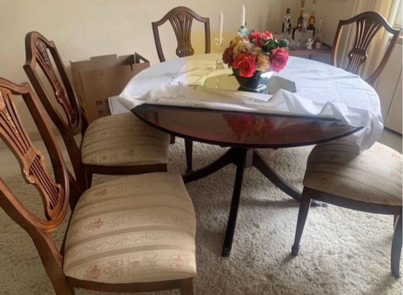 Elegantes Esszimmer mit einem ausziehbaren Tisch und sechs Stühlen im alten Englischen Style.
