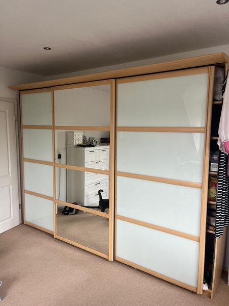 zum Verkauf steht ein gepflegter Kleiderschrank, Maß: 3,00 breit, 2,25 hoch, 0,60 tief. Farbe: Buche/Ahorn, Kleiderstangen und Regale, Schiebetüren Glas.