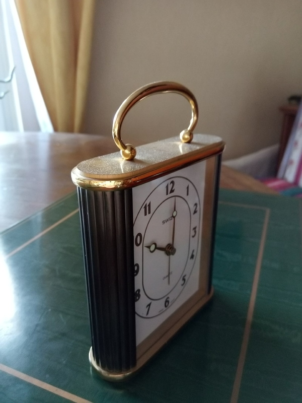 Messing Uhr Tischuhr 10,5 cm breit, ca. 3,3 tief. 12 cm hoch ohne Haken.Bei der Uhr müsste vielleicht mal eine Wartung gemacht werden. Es ist eine elektrische Uhr. Privat Verkauf kein Rückgnahme