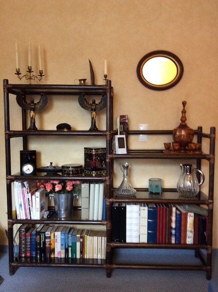 Sehr schönes dunkelbraunes Rattanregal. Sauber verarbeitet und mit Leder eingebunden. Mit 8 Rauchglasscheiben als Einlegeboden. Maße: 1,55m komplett breit, linke Seitenhöhe 1,5m, rechte Seitenhöhe 1,15m, Tiefe 38cm. Verkauf in Stuhr. Ohne Deko! Preisvorstellung: 100€ Tel.:04221 399291