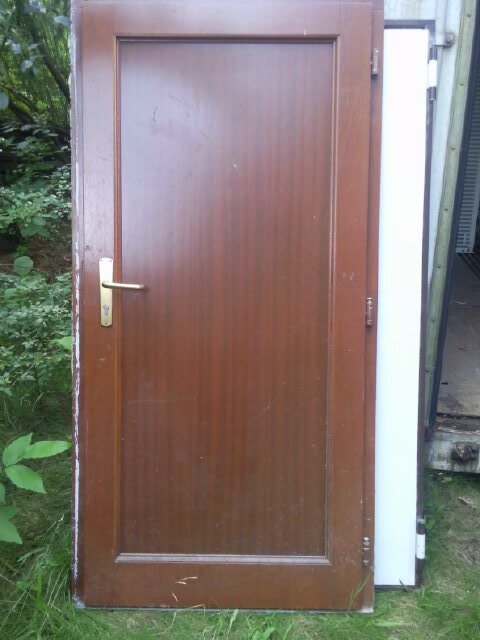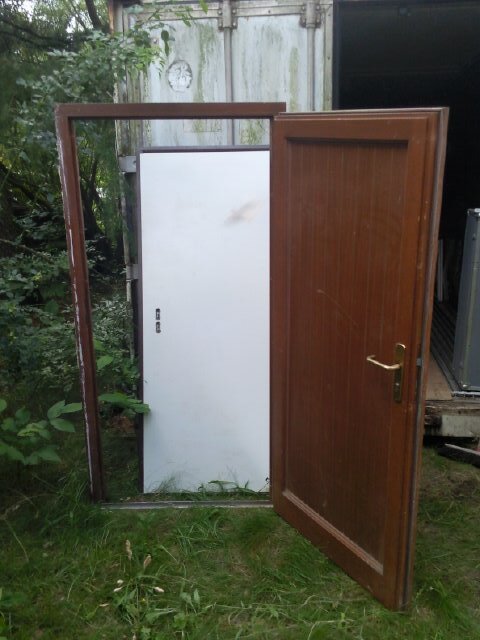 3 x Nebeneingangstür (TOPQUALITÄT, massives Echtholz Meranti), von innen gesehen rechts angeschlagen inkl. Griff; 1. Rahmen-Breite 982 mm x Rahmen-Höhe 1980 mm, 2. Rahmen-Breite 1150 mm x Rahmen-Höhe 2180 mm, 3. Rahmen-Breite 1150 mm x Rahmen-Höhe 2200 mm, jeweils Dicke 55 mm; Baujahr 1997, war 10 Jahre eingebaut, 2007 wieder ausgebaut und seitdem trocken und dunkel gelagert - daher in sehr gutem Zustand, insbesondere alle Gummis in gutem Zustand und dicht schließend.