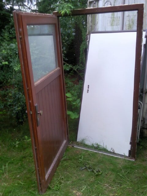 Kellereingangstür (TOPQUALITÄT, Echtholz, Meranti), 1-Feld-Fenster, von innen gesehen links angeschlagen inkl. Griff; Rahmen-Breite 1150 mm x Rahmen-Höhe 2065 mm, Dicke 55 mm; Baujahr 1997, war 10 Jahre eingebaut, 2007 wieder ausgebaut und seitdem trocken und dunkel gelagert - daher in sehr gutem Zustand, insbesondere alle Gummis in gutem Zustand und dicht schließend.