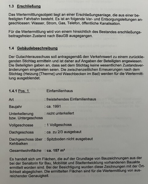 Vom Gutachterausschuss für Grundstückswerte wurde 2023 ein Verkehrswertgutachten erstellt. Daher ist der Preis auch nicht verhandelbar. 2023 wurde das Haus renoviert und auch eine neue Gasheizung eingebaut. Teile vom Gutachten sind in den Bildern zu sehen. Bei "intensivem" Kaufinteresse kann das Gutachten auch vollständig eingesehen/übergeben werden (wegen Datenschutz).