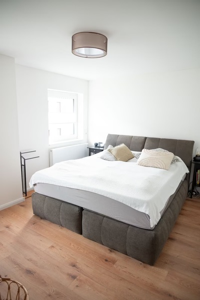 Eine Vollholztreppe ebnet den Weg ins Obergeschoss mit Schlafzimmer, modernem Vollbad (Fußbodenheizung + Handtuchheizkörper) und einem weiteren Zimmer. Über dieses gelangt man in das ausgebaute Dachgeschoss, wo sich ein zusätzlicher Raum befindet, mit viel Licht durch eine neu entstandene Gaube und direkten Zugang zur ca. 15 m² großen Dachterrasse. Hier lässt sich die Sonne bis in den späten Abend genießen.