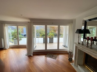Das lichtdurchflutete Wohnzimmer wird zum Mittelpunkt des täglichen Lebens. Großzügige Fensterfronten, ein eleganter Designerschrank und der stimmungsvolle Gaskamin schaffen ein Ambiente, das sowohl für entspannte Abende als auch für stilvolle Gästeempfänge ideal ist. Von hier aus betreten Sie den beeindruckenden Süd-Balkon, der sich über die gesamte Breite der Wohnung erstreckt – ein sonniger Rückzugsort mit maximaler Privatsphäre.