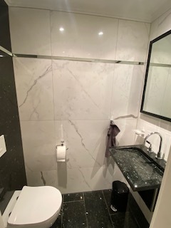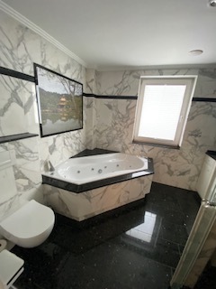 Das große Marmorbad präsentiert sich als wahre Wellnessoase: Ausgestattet mit einer großzügigen Dusche, einer entspannenden Blubberwanne und edlen Natursteinoberflächen, lädt es zum Abschalten ein. Ergänzt wird dies durch ein ebenso hochwertiges, stilvoll gestaltetes Marmor-Gäste-WC.