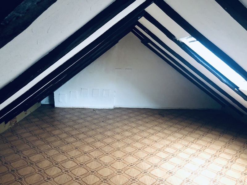 ausgebauter Spitzboden mit schönen Holzbalken in dunkler Farbe und Fenster