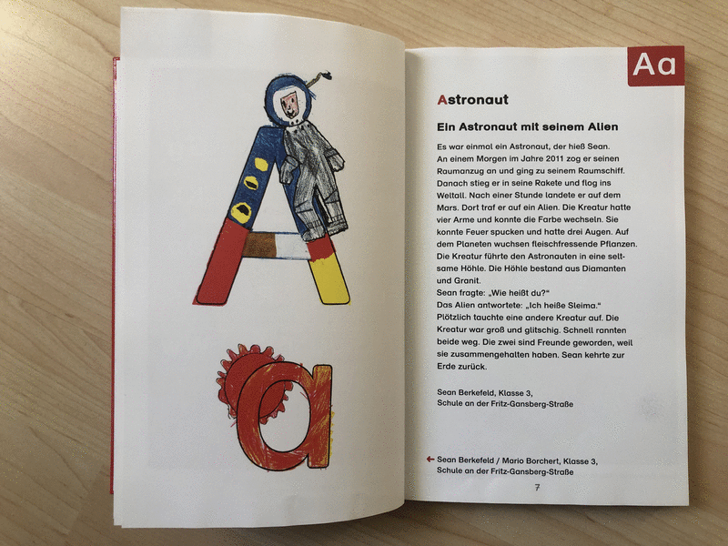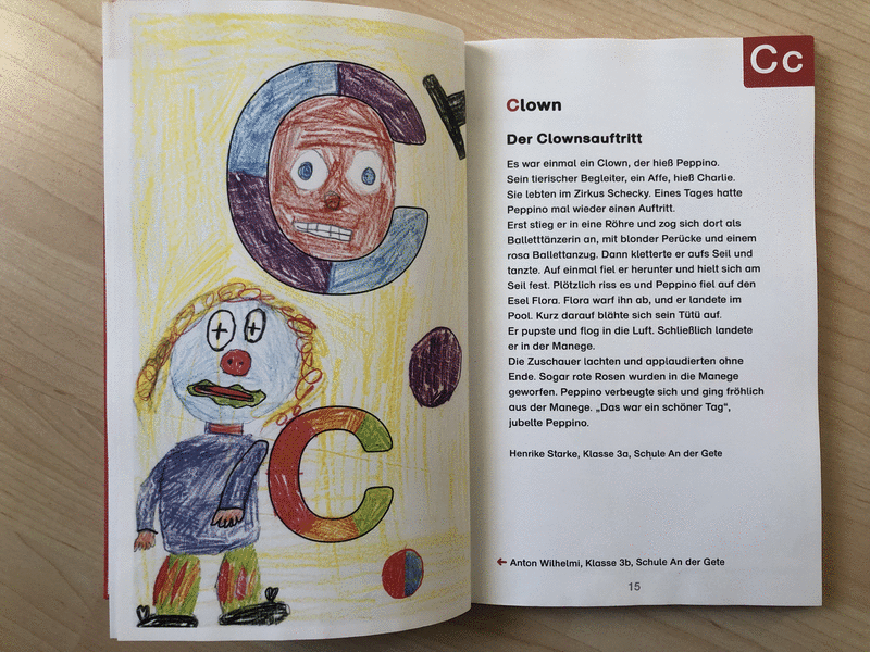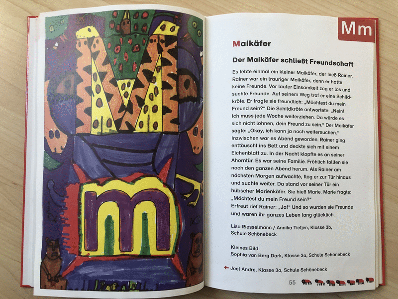 Bremer Kinder schreiben und malen für Kinder - Allererster Lesespaß. Früher, als es erst einige Buchstaben gab, kamen diese zusammen, um zu spielen. Zum Beispiel das A für die Ameisen, das E für den Esel, das I für den Igel und das V für den Vogel. Die Buchstaben fingen an herumzutollen, zu toben und zu springen. Sie kicherten und lachten vor Freude und Vergnügen. Plötzlich kam das I auf die Idee, das V auf seine Schulter zu nehmen. Das sah sehr komisch aus. Alle anderen Buchstaben staunten und riefen alle gemeinsam: „Sei willkommen, Du Ypsilon! Jetzt können wir auch unser großes Yak richtig buchstabieren!“ - Die Geschichten sind lustig geschrieben. Kinderbilder, Grundschüler, Buchstaben, Lesen lernen, Alphabet, lernen, Schreiben lernen, Das erste Buch e. V., Schule.