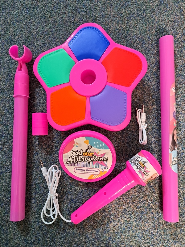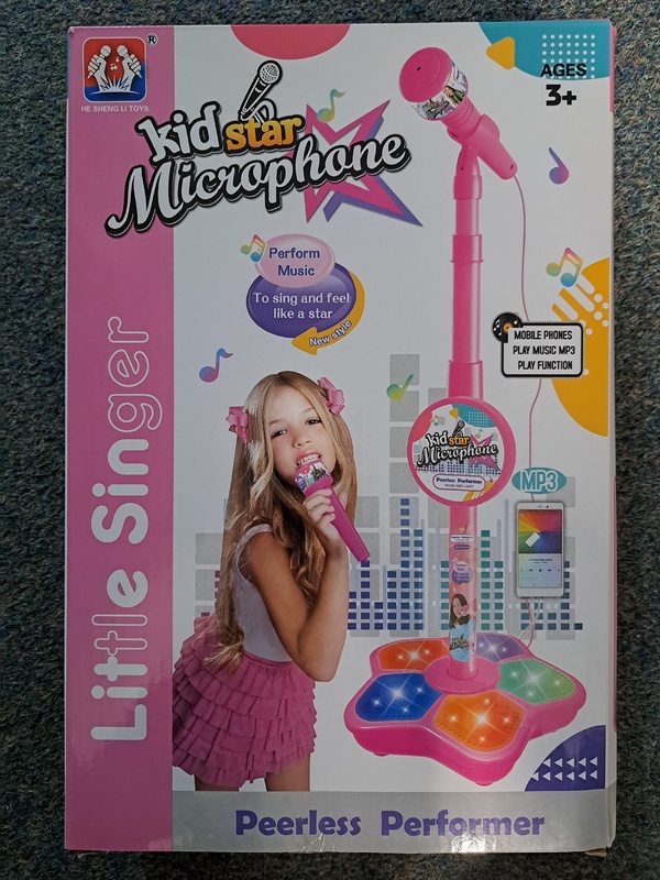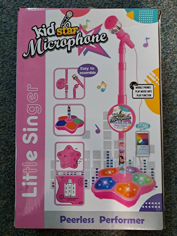 ich verkaufe hier ein, leider doppelt gekauftes, neues, unbenutztes Mikrofon für kleine Gesangsinterpreten ab 3 Jahren mit einer MP3 Anschlussfunktion. Max. Höhe ca. 1m. Notwendig für den Gebrauch sind 3 Batterien AA.