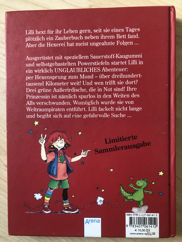 Hexe Lilli ist eben immer wieder überraschend! Und diesmal hat sie sich etwas ganz Besonderes ausgedacht: Ihr neues Buch ist auf dem Cover mit einem Metallschild ausgestattet! So originell wie ihr erstaunlicher Flug zum Mond! Ausgerüstet mit speziellem Sauerstoff-Kaugummi und selbstgebastelten Powerstiefeln startet Lilli in ein wirklich unglaubliches Abenteuer. Per Hexensprung zum Mond 184.000 Kilometer weit! Doch selbst dort gibt es Probleme und Lilli hat schnell alle Hände voll zu tun: Wird sie die entführte Mondprinzessin befreien" Die defekte Sportrakete reparieren" Und traut sie sich wohl auf den geheimnisvollen grünen Planeten"