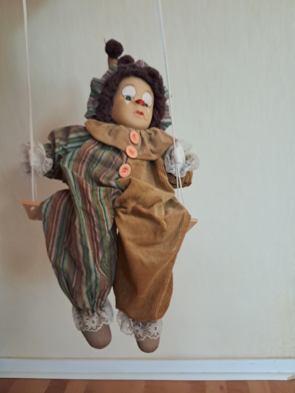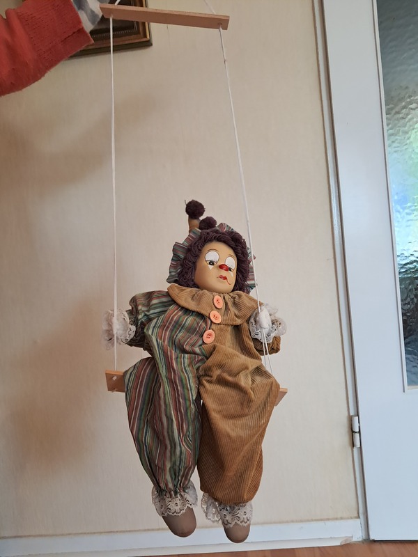 Marionette Clown Puppe hoch ca.56cm, breite vom Sitz ca. 27cm Schaukel ca. 59cmHoch. Preis 22 Euro Privatverkauf keine Rückgabe