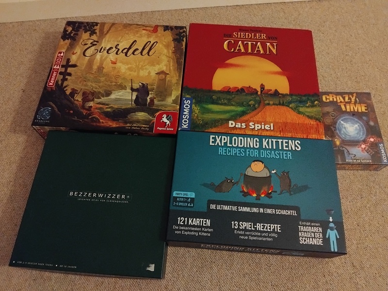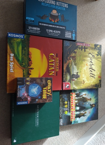EVERDELL ( zwei Stellen am Stamm sind leicht eingeknickt, geflickt) SIEDLER VON CATAN ( hier fehlt nur eine Straße, EXPLODING KITTENS, BEZZERWIZZER, CRAZY TIM ( original verpackt )