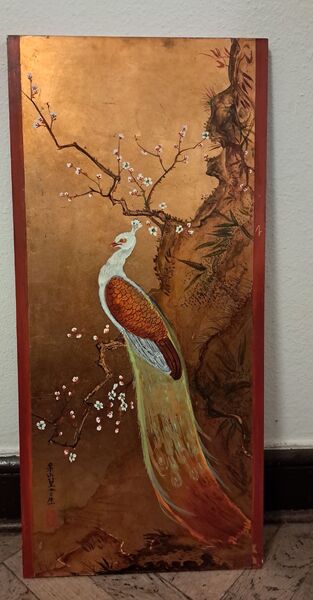Wir möchte diese zwei asiatisch bemalten Holzpaneele mit Pfau und Schwalben verkaufen. Sie sind jeweils 86 x 39 cm groß, ca. 1 cm dick und ziemlich schwer (also wohl Vollholz?). Rückseite mit grünem Filz bezogen.