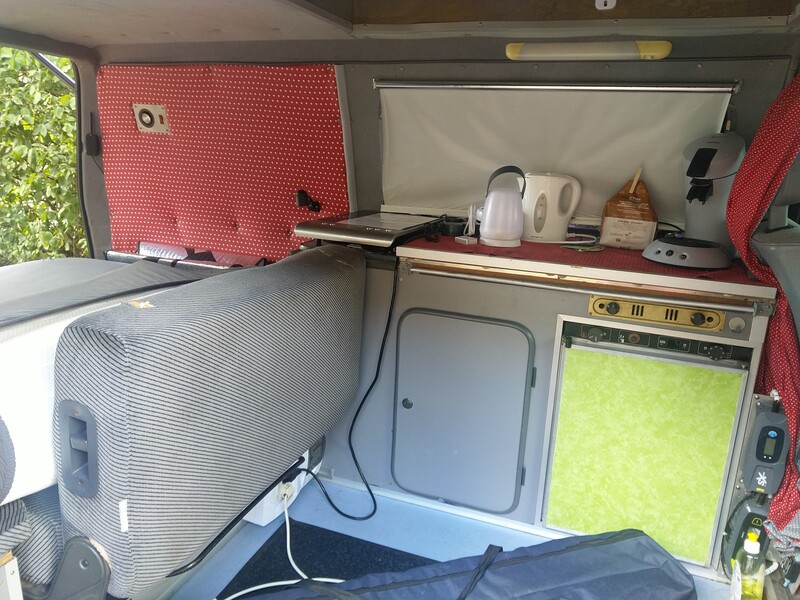 In der Dachbox sind Tisch, Stühle und Auflagen. Kühlschrank(Gas, 220V und 12V), Gasherd, Spüle, Kaffeemaschine, Geschirr und Induktionsplatte sowie Ventilator sind an Bord. Am Heck ist ein Fahrrad-Träger und der Bus hat eine Hänger-Kupplung.