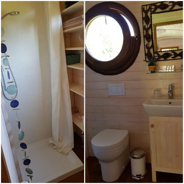 An den Wohnraum schließt sich das Bad mit Dusche, WC und Waschbecken an (ein Fön ist vorhanden ). Ein rundes Kippfenster sorgt für Licht, Lüftung und ein besonderes Ambiente.