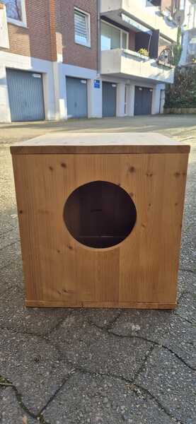 Viereckige Holzbox, selbstgebaut, als Rückzugsort für Katzen oder andere Kleintiere. Massivholz, guter Zustand.