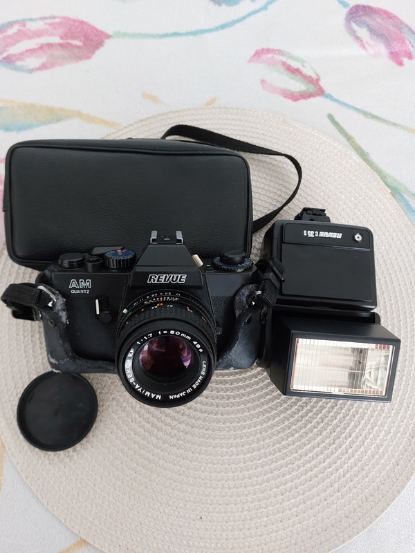 Spiegelreflexkamera AM Quarz analog mit Mamiya Sekor EF Objektiv 1,7 50mm mit Elektronenblitzlicht und Tasche,Bedienungsanleitung gebraucht ,gut erhalten Von einem Fotogeschäft gesichtet