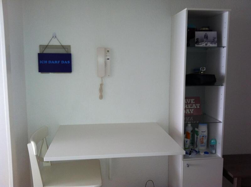 Die Wohnung befindet sich im hinteren Souterrain. Sie ist sehr hell, da viele grosse Fenster, plus Terrassentür. Man kann auch auf einen kleinen Hinterhof. Das Zimmer ist mit Nussbaumlaminat ausgelegt. Der Flur, in dem sich auch die Pantryküche befindet, und das Bad sind gefliest.