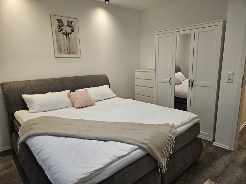 Das Schlafzimmer ist mit einem bequemen Bett, Kleiderschrank sowie zusätzlichen Stauraummöglichkeiten ausgestattet. Kissen, Decken, Bettwäsche sowie Handtücher sind nach Absprache auch vorhanden.